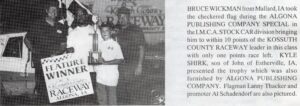Emmetsburg’s Bruce Wickman recorded at least 41 wins at the Algona track and was a two-time track champion. Among his notable victories, he won the Kossuth County fair race five times and won a fall special at the track.